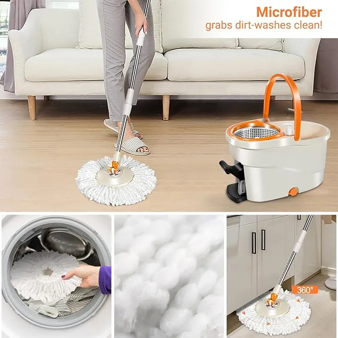 【High-quality Materials】: This spin mop and bucket features from stainless steel handle, which is nondeformable and durable. So this spin mop could be used for a long term. This material would not damage floors and would improve cleanliness efficiency.