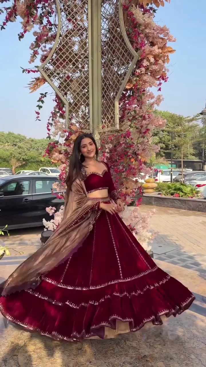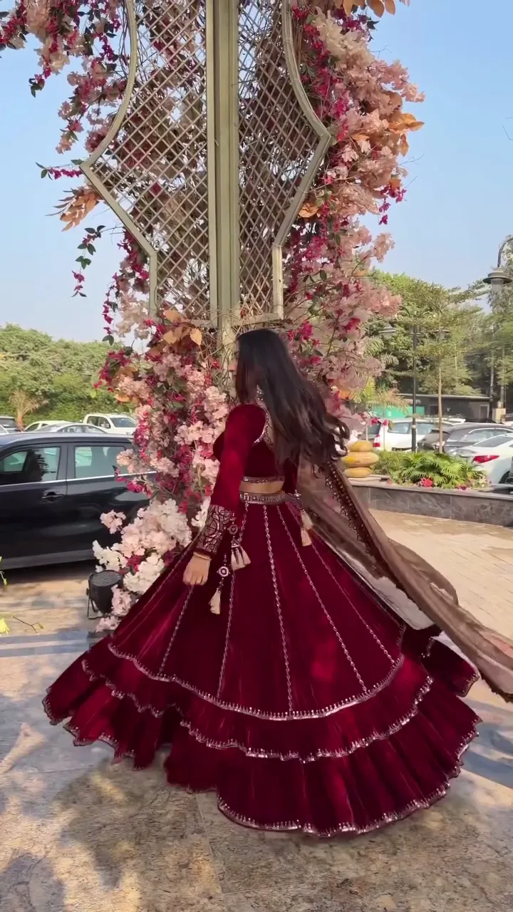Make a striking statement at festive celebrations and weddings with this deep wine velvet lehenga set, designed to exude elegance and luxury. The rich velvet skirt offers a graceful drape and a regal look, making it perfect for special occasions, receptions, and traditional events.