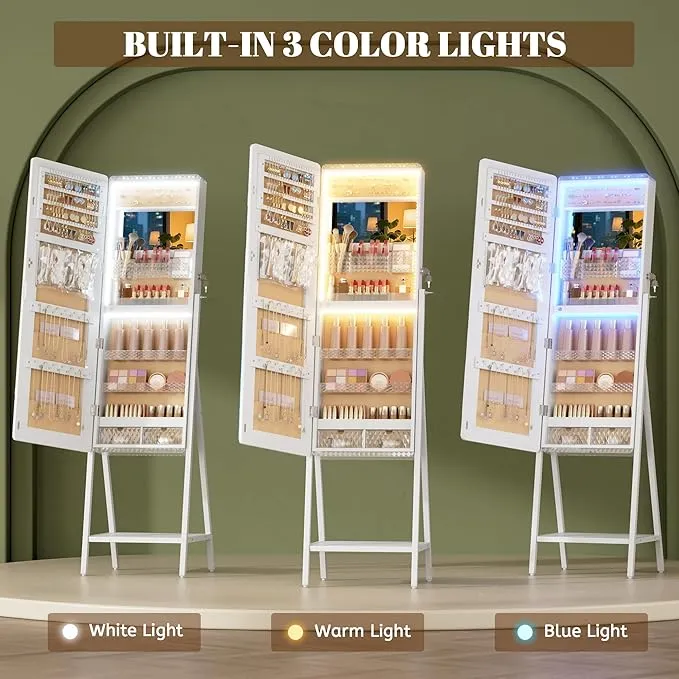 [3-in-1 Jewelry Cabinet] Enjoying the triple benefits of a jewelry organizer, full-length mirror, and vanity mirror will give you a lot of fun dressing up. HD full-length mirror jewelry cabinet offers you a head-to-toe view of your outfit in real image and you can store all jewelry in order with this jewelry organizer stand