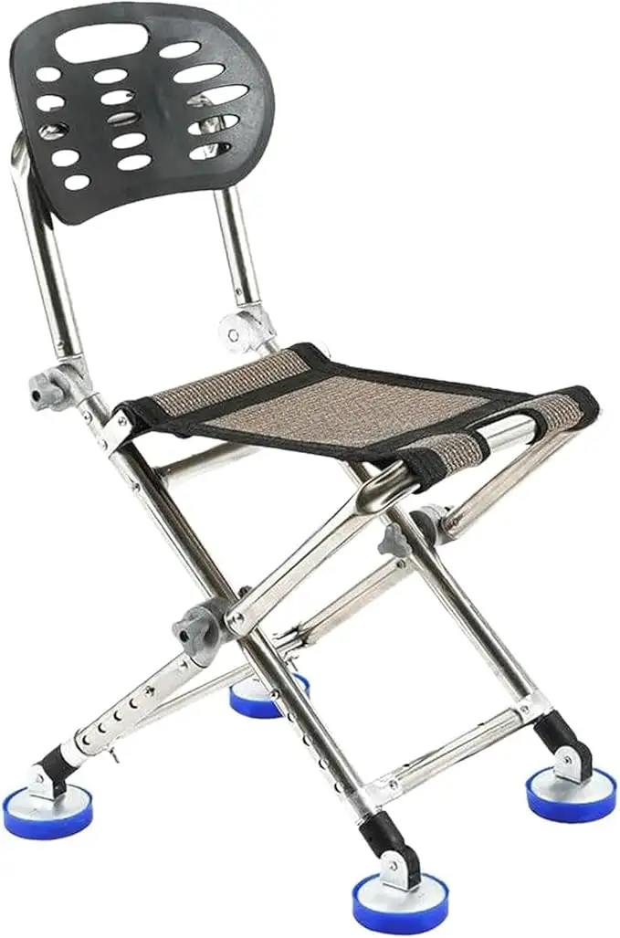 The chair features a durable fabric seat that balances flexibility and strength, offering a comfortable sitting experience while remaining easy to clean. The breathable material reduces heat buildup, making it ideal for outdoor use such as fishing, camping, gardening, or waiting areas. The back support adds extra comfort compared to standard foldable stools.
