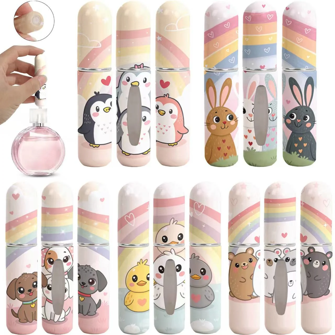 This cute cartoon mini perfume spray bottle is a stylish and practical solution for carrying your favorite fragrance wherever you go. Designed with adorable animal and pastel patterns, it adds a playful touch to your daily essentials while remaining compact enough to fit easily into pockets, handbags, cosmetic pouches, or travel kits. Its slim, lightweight body makes it ideal for on-the-go use without taking up extra space.