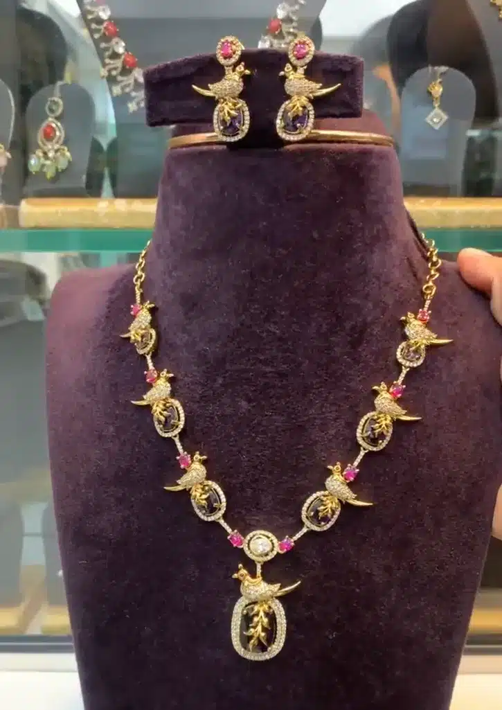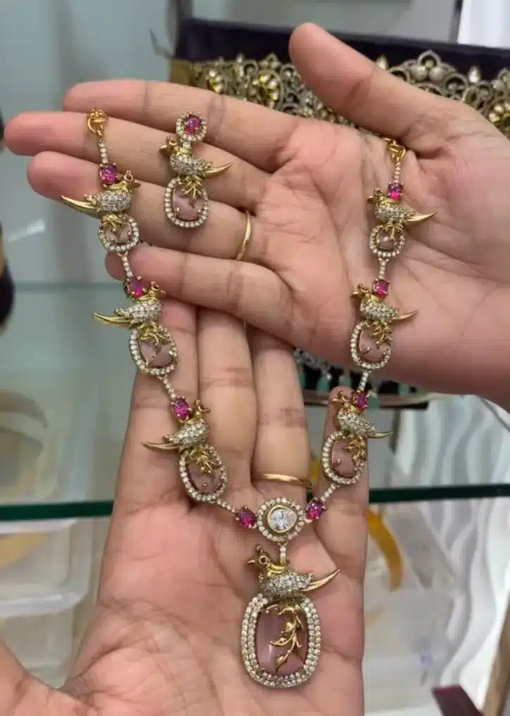 The set also includes matching earrings that perfectly complement the necklace design. These earrings feature similar bird motifs and stone embellishments, creating a coordinated and harmonious jewelry set. The earrings are usually lightweight and comfortable, allowing you to wear them for long hours without discomfort.