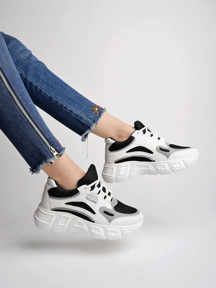 Step into effortless style with these trendy black and white chunky sneakers designed to combine fashion with everyday comfort. The bold contrast of black overlays against a clean white base creates a modern and eye-catching look that easily complements a variety of outfits. Whether paired with jeans, joggers, or casual dresses, these sneakers add a fashionable touch to any everyday wardrobe.